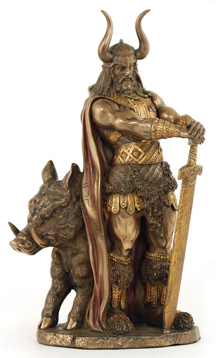 Exquisitely capturing the essence of the Norse God of farming, weather, and male fertility, this statue depicts Freyr and the golden boar he was said to ride.