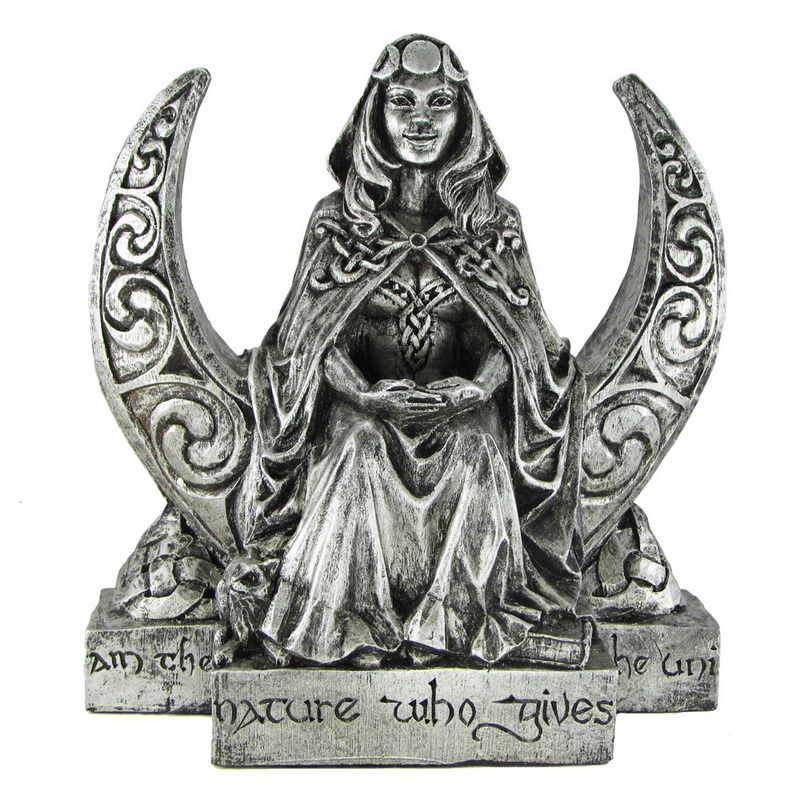 Venerated for centuries as nurturer, mistress of magic, and protectress, the Goddess is intimately connected with the moon. She moves us the way the tides move the waters of the ocean. Inspired by the High Priestess card of the tarot, the Moon Goddess embodies feminine wisdom. Place something precious within her arms that you wish to empower with her energy. The line around the base is from "The Charge of the Star Goddess" and reads: "I am the soul of nature who gives life to the universe."
