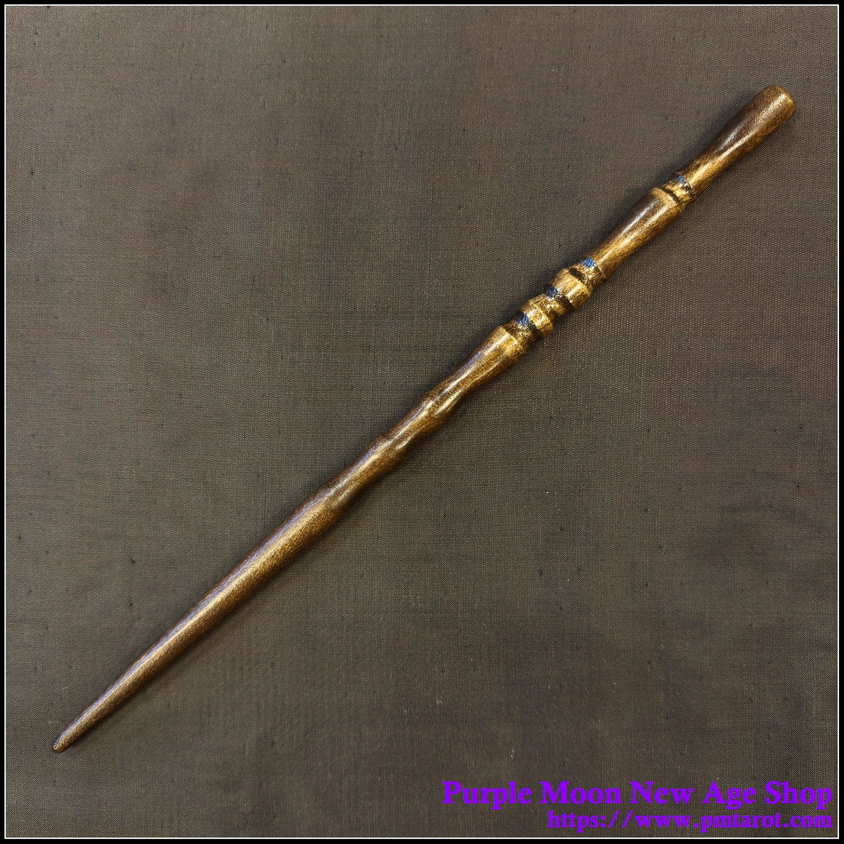 This wand is made from one piece of Birch, making it nice and sturdy for years of spellcasting. The handle has been given a solid dark stain; the tip has had the stain rubbed off, leaving the grain to show through.