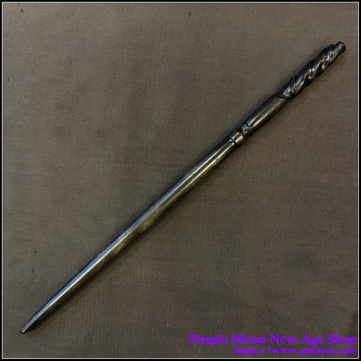 This wand is made from one piece of Birch, making it nice and sturdy for years of spellcasting. The handle has been given a solid dark stain; the tip has had the stain rubbed off, leaving the grain to show through.