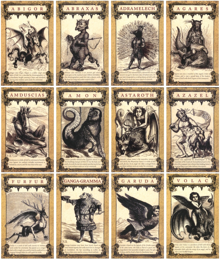 這個有別於一般78張塔羅牌架構的惡魔塔羅牌,是根據1893年的地獄辭典中的版畫而來,其中繪製了69張惡魔的圖象,跟天使的概念相同,當人在下定心中的某些意念時,有時候會受到這些無形的守護者所影響,當然有好也會有壞,惡魔塔羅牌而是從其他各種文化來源讓我們了解到各種惡魔的屬性,進而了解到自己的詮釋和見解,去參透領悟每張卡的主題,以及專注在體會這些惡糢強化了什麼負面的意義,在一個傳統的卡片中得到調整自我的訊息!