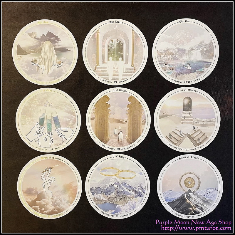圓形卡片有金箔亮點裝飾、鍍金牌邊和柔軟的天鵝絨層壓飾面,為你的塔羅牌閱讀體驗帶來全新的奢華和深度。