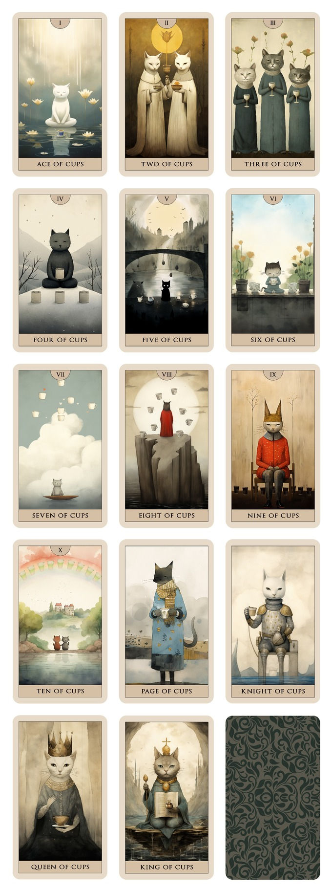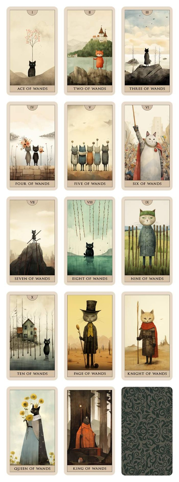 Cat Tarot 包括牌背在內,共有 78 張獨特的插圖。這套牌分為兩種類型的牌:大阿卡納牌和小阿卡納牌。