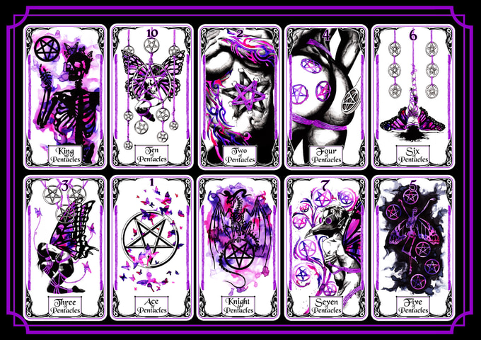 FaeBound 塔羅牌是我的 Bound 塔羅牌系列中的第二章,它是用黑色和紫色墨水手繪的,並帶有水彩色彩。像往常一樣,我在掃描卡牌並將卡牌放在一起之前使用了傳統媒介進行工作。
