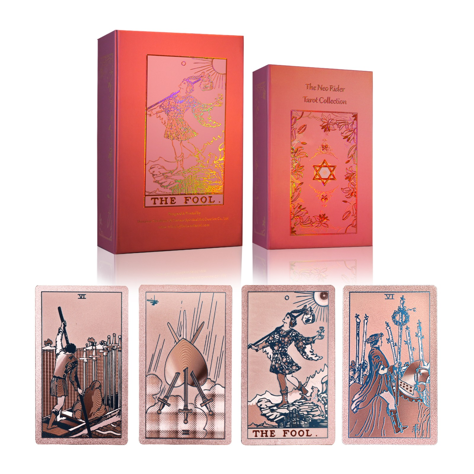 貨品介紹: 350gsm的藝術紙卡,高質感磁鐵翻蓋盒,防水塑料材質,金箔印刷。運用玫瑰金的牌卡,將原先偉特塔羅牌中的色調改為浪漫柔和的配色,暗黑轉靛藍,讓我們在看牌的時候,就不會感到這麼的害怕與擔憂了!