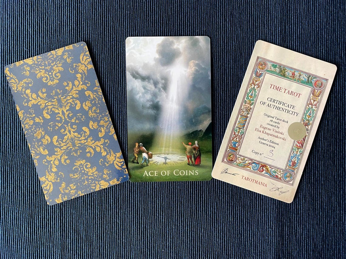 The Time Tarot is a 78 card deck golden gilded and companion book in English (192 pages) in the luxury magnetic box, accompanied by the Certificate of Authenticity numbered and signed by authors. Free pdf of the book in French or Russian.