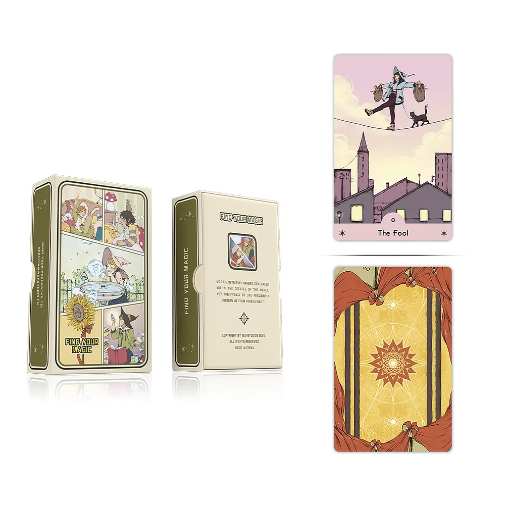 貨品介紹: WohStudios 與出版社取得授權正版印刷 Find Your Magic 塔羅牌,同時將印刷工藝升級,提升品質。卡牌使用進口黑芯紙,空氣層壓紋以及環保水油,令使用起來更順滑。