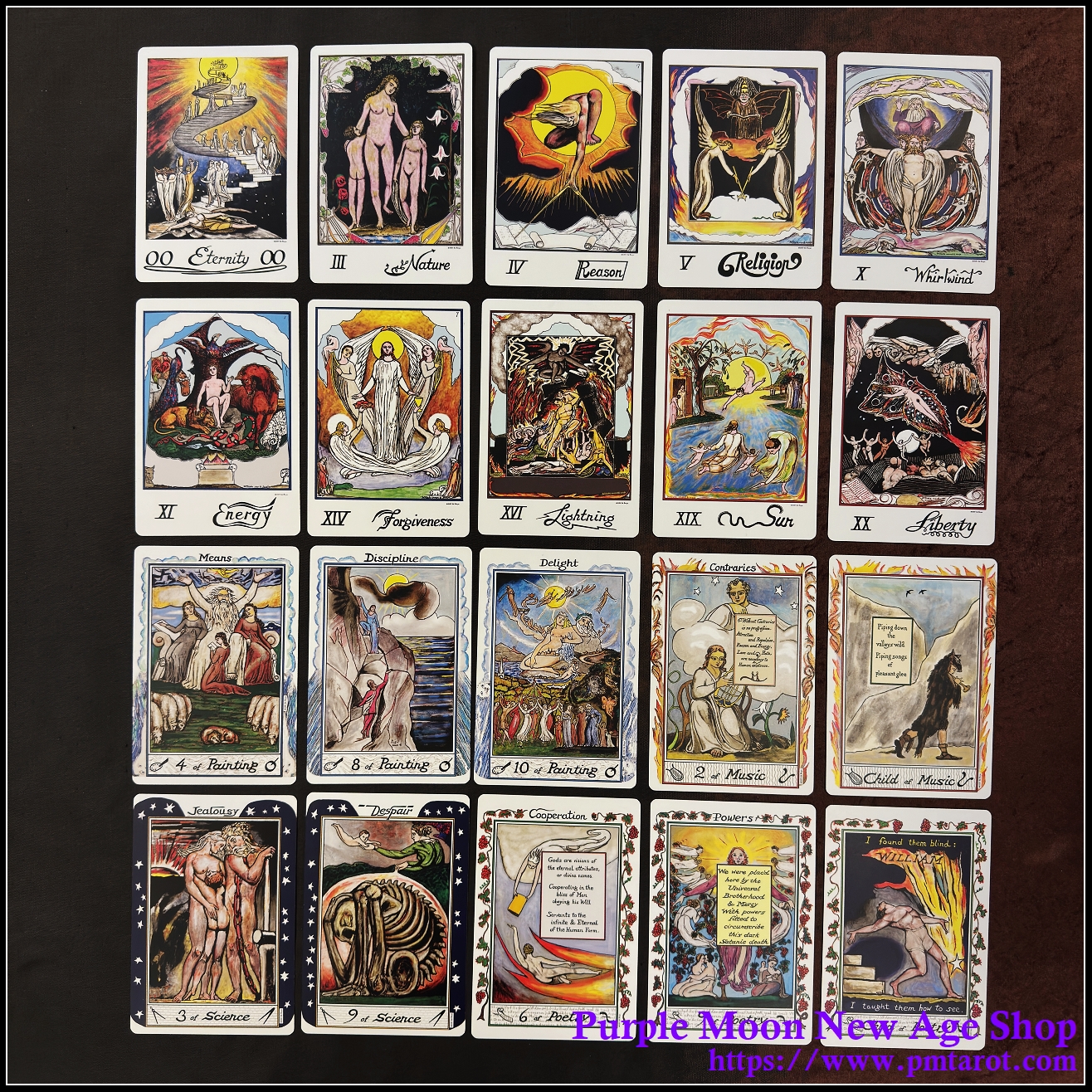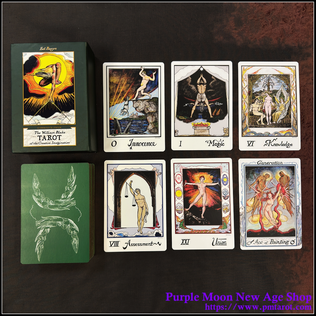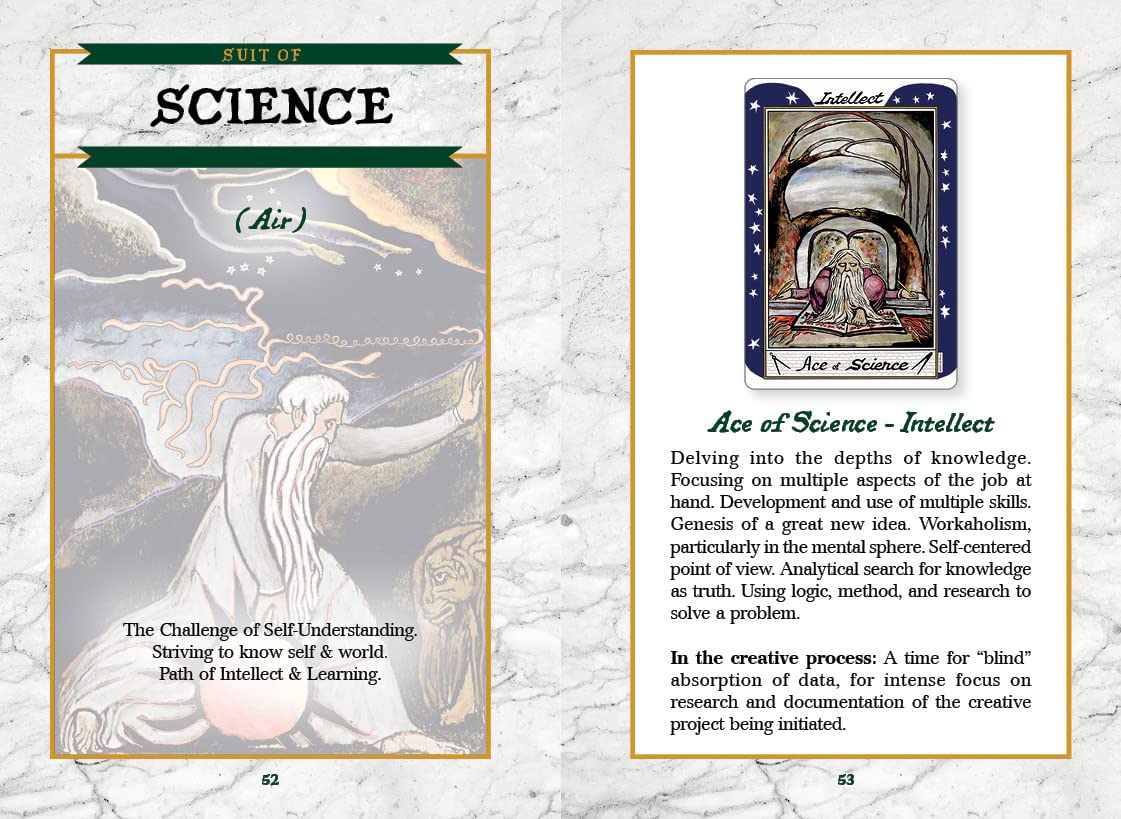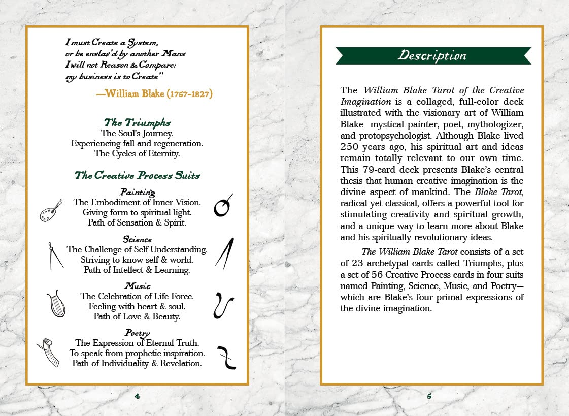 This deck and guidebook box set contains 23 archetypal cards called Triumphs, together with a set of 56 Creative Process cards in four suits named Painting, Science, Music, and Poetry—which are Blake’s four primal expressions of Divine Imagination.