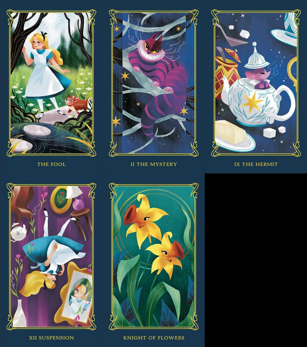 Let Alice, the Mad Hatter, and the Queen of Hearts guide your tarot practice with this beautifully illustrated tiny tarot deck inspired by the Disney classic animated film Alice in Wonderland.