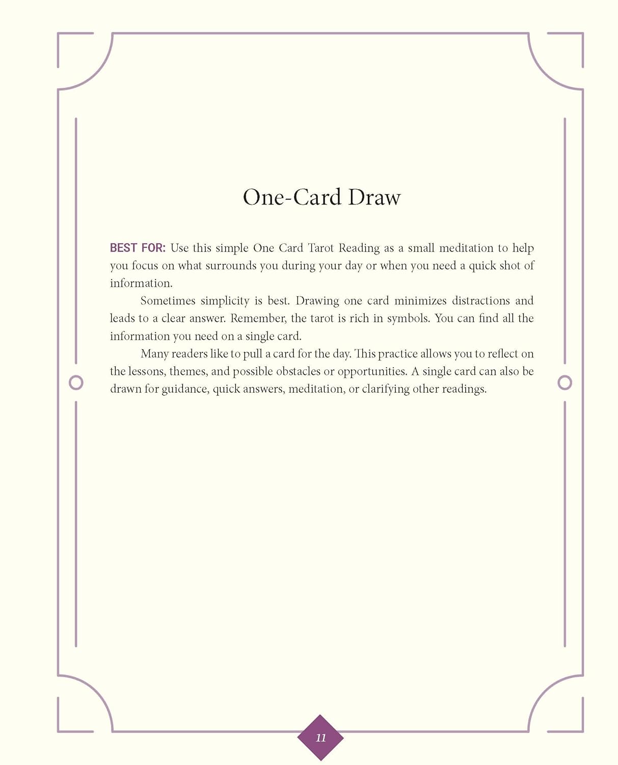 Fully illustrated layouts and instructions for eight spreads—1-card, 2-card, 3-card, 4-card, Celtic Cross, Horseshoe, Astrological Wheel, and Weiser’s own Ankh spread