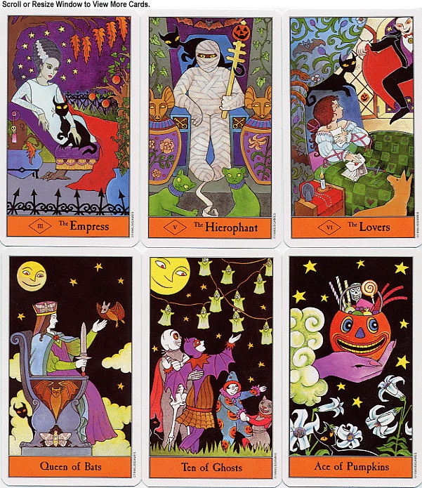 這副牌的圖案基於 RIDER WAITE TAROT 的,加入萬聖節裝飾及一些恐怖的電影的鏡頭,就畫成一副 78 張的 HALLOWEEN 塔羅,例如皇后 EMPRESS 和皇帝 EMPEROR 就是 FRANKENSTEIN 以及 BRIDE OF FRANKENSTEIN,每張牌都有一隻黑貓,你會很容易發現牠。