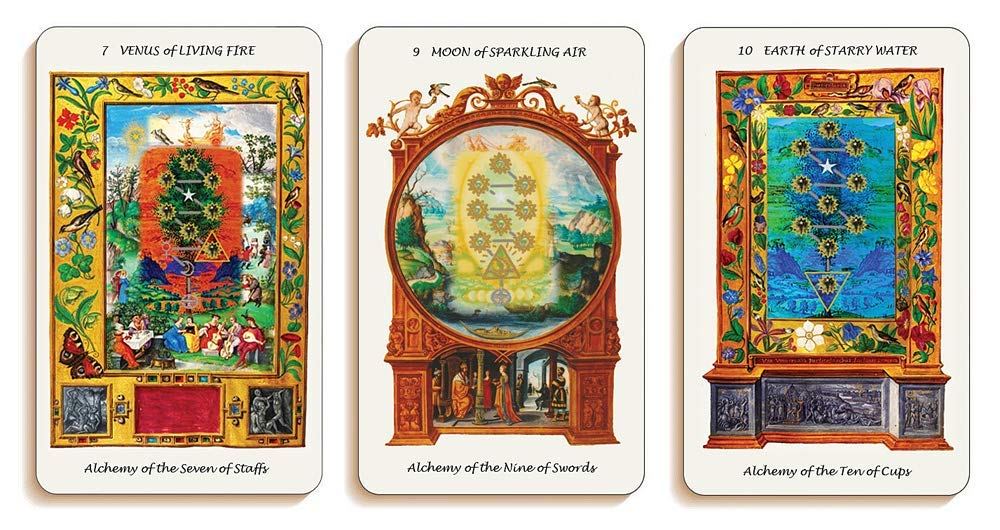 Within the Splendor Solis Tarot cards the 22 major arcana are the Artisans, the archetypes that reveal their transformative powers along the pathways of the Tree of Life. The 56 minor arcana are presented as the four suits with magically painted Element colours, expressing the four worlds of Spirit, Soul, Mind and Body.