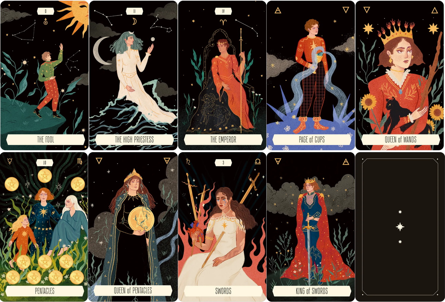The Major Arcana correspond to the 12 Zodiac signs and 10 planets; the Minor Arcana are divided into the 4 elements and corresponding Zodiac signs: Swords is represented by Gemini, Libra and Aquarius (air signs), Cups by Cancer, Scorpio and Pisces (water signs), Wands by Aries, Sagittarius and Leo (fire signs), Pentacles by Taurus, Virgo and Capricorn (earth signs). Traditional meanings of the RWS tarot are connected to new and unexpected astrological interpretations.