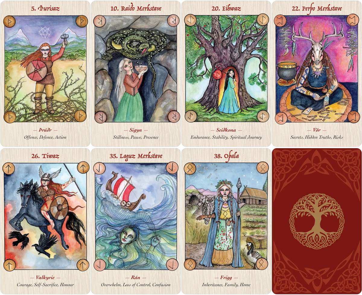 Drawing from an ancient well of women’s wisdom, this symbol-enriched oracle brings the power of the Norse Goddesses into the light and makes the mysterious art of rune divination accessible for all. The imagery and messaging of this exquisitely crafted set are infused with Old Norse concepts, deities, sagas, iconography and lore. Each card holds its own rune spirit, is empowered by a Goddess and has red edges to help activate its magick. A beautiful journey through the archaeological, mythical and esoteric wonders of the Elder Futhark for relatable, supportive guidance that speaks to the core of your questioning and delivers immediate, practical answers of fate and fortune. Includes 39 red painted edged cards and 160-page full-color guidebook.