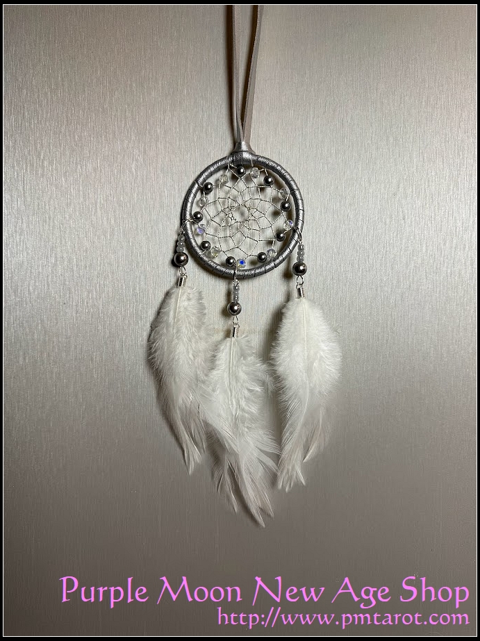 Simple dream catcher decorated with feathers and beads. These are often hung above cribs or in the windows and above doorways of the rooms where children sleep and sometime near the sleep area of adults with troubled sleep to catch the bad dreams and the spirits who send them within the web of the dream catcher.