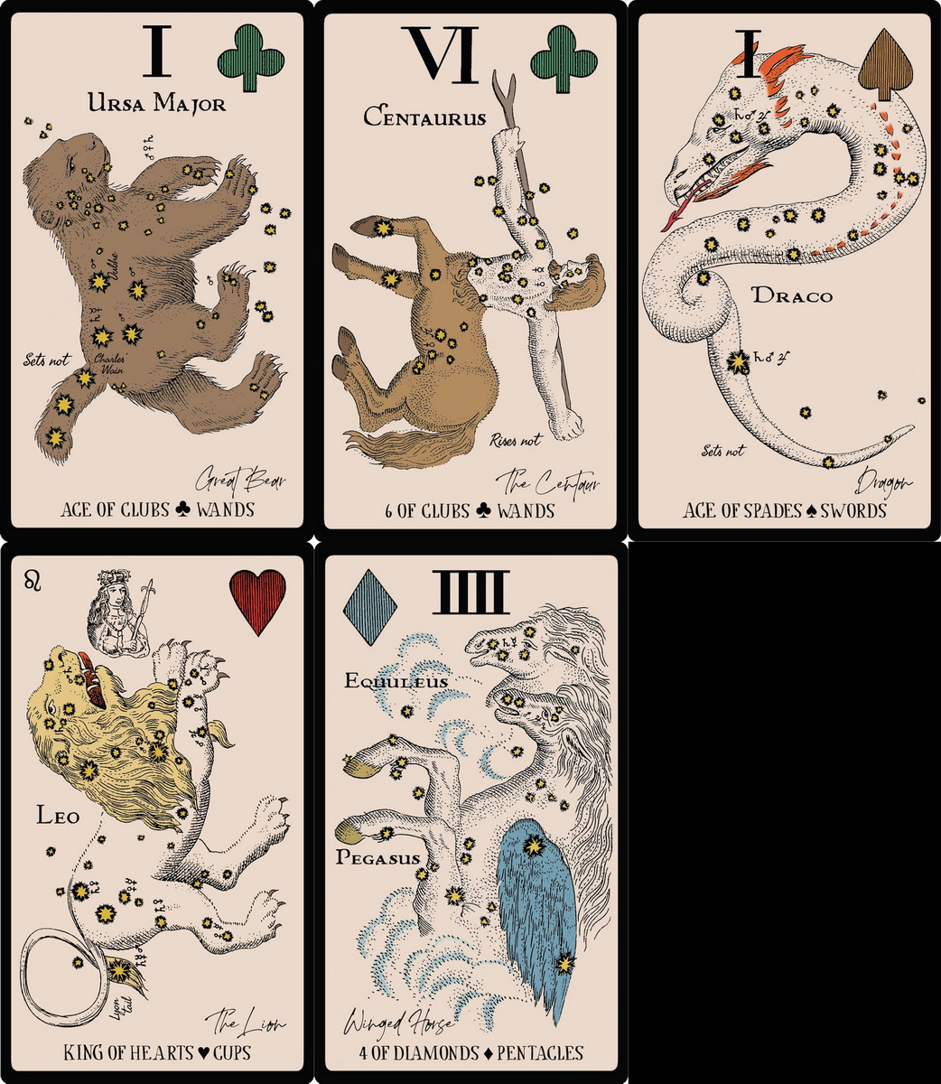 Although many of the constellations have their genesis in lore and myth stretching as far back as Egyptian, Babylonian, and Phoenician origins, most the of the interpretations in the companion book derive from Greek myth. By including associations with the minor arcana, the author invites a playful exploration between the tarot, the fixed stars, the zodiac, and playing card cartomancy. The deck has been crafted to align with the fifty-six cards of the tarot minor arcana, with interpretations that follow the tradition of the Rider-Waite-Smith system of symbolism and archetypes.