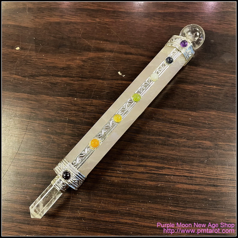 With the warm, pink tones of a faceted piece of rose quartz forming its core, the 7 chakra rose quartz wand is a wonderful ritual tool for healing emotional hurts, and invoking love within your spells and magic. Rose quartz is a crystal known for possessing an energetic quality that is nurturing to the heart, and as such it is often used in crystal healing to help mend heart break and all number of other emotional difficulties. Similarly, in magic it is a popular addition to love spells, where its warmth can help foster nurturing love and affection. This wand is wonderful for seeking this quality within your practice, and is only enhanced by a clear quartz sphere at its back and a clear quartz point at its tip, used to gather and direct energy. Similarly, it features seven precious stones set along its length, representing the seven chakras to help you clear, balance, and focus the energies of your chakras.