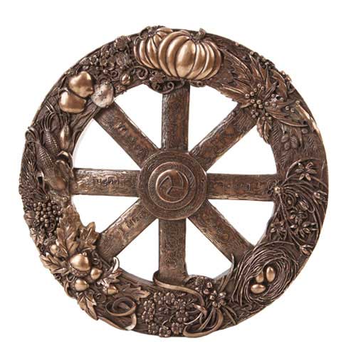 本產品需要付全數訂金訂貨,一般需時約 4-8 星期到貨。A stunning Wheel of the Year plaque with an amazing array of detail hand picked for each holiday. The names of the Sabbats and Esbats are carved into the spoke of the Wheel leading to each holiday. This plaque has a wall hanger mounted behind each holiday's symbol so that it may be rotated throughout the year to keep the current festival on top if desired. Cold Cast Resin