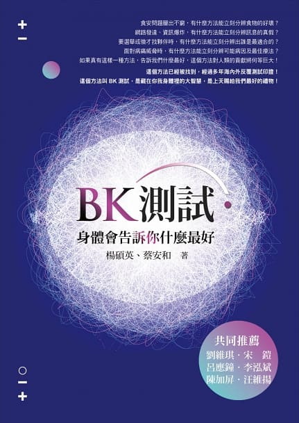 BK測試是一種非常簡單的方法──由一個「施測者」用手壓另一個「受測者」平舉的手臂,針對某個人事物開始陳述詢問,並測試當下其肩肌是否鎖緊,以測定其為好壞、真偽與善惡。它的客觀性、重複性、普遍性都高得驚人,遠遠超過任何醫學上的實驗。作者楊碩英教授及蔡安和在此領域研究超過十年,透過本書想與大家分享累積經驗下的創新突破及意外發現。