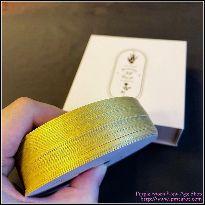 圓形卡片有金箔亮點裝飾、鍍金牌邊和柔軟的天鵝絨層壓飾面,為你的塔羅牌閱讀體驗帶來全新的奢華和深度。