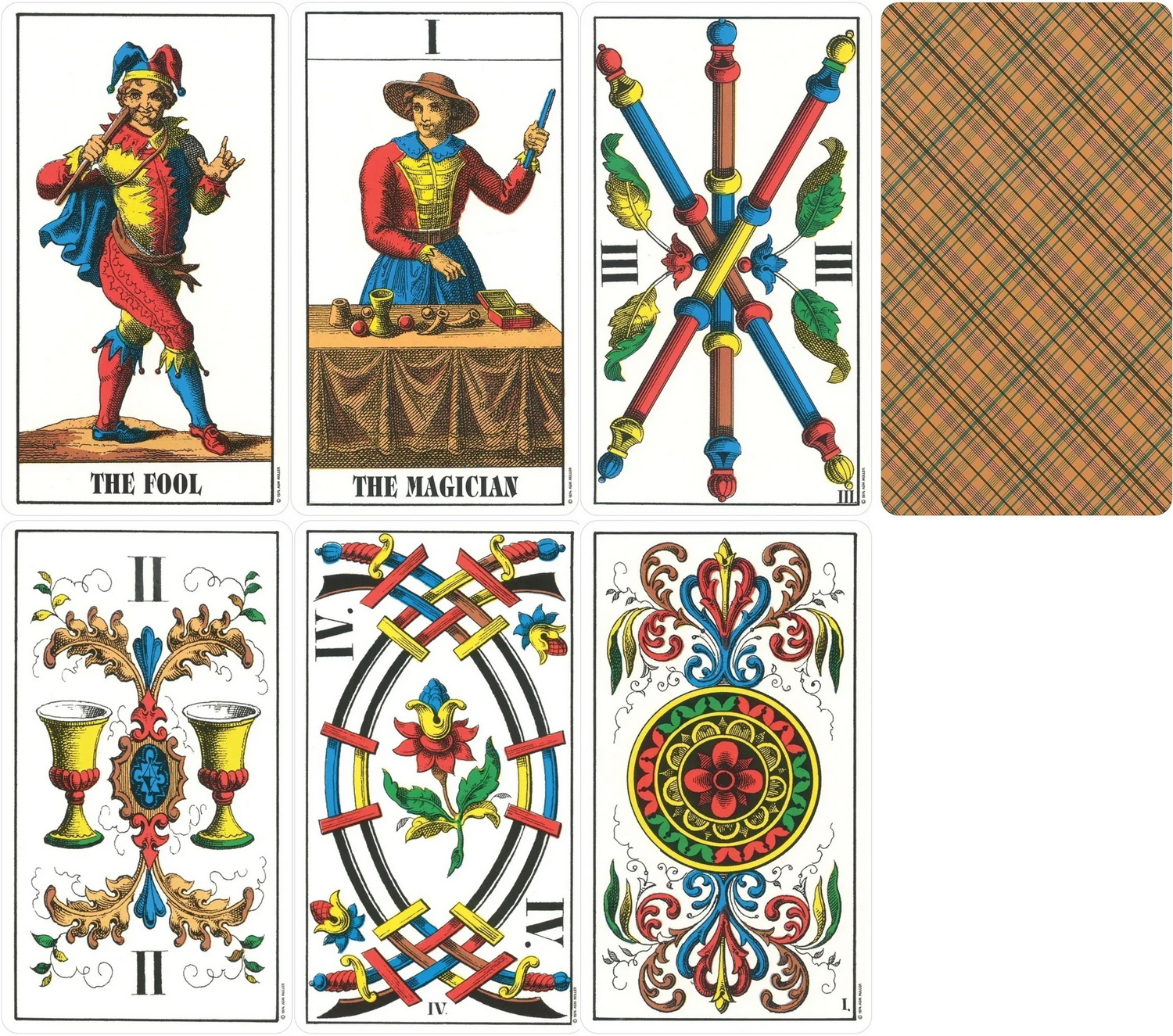 這套色彩繽紛的馬賽風格塔羅牌包含 22 張大阿卡納牌和 56 張小阿卡納牌,全部帶有英文標題。 小阿卡那牌的四種花色是傳統的劍、警棍、聖杯和金幣。 還包括一本十頁的小冊子,其中包含大阿卡納的解釋以及十張凱爾特十字牌陣的閱讀說明。