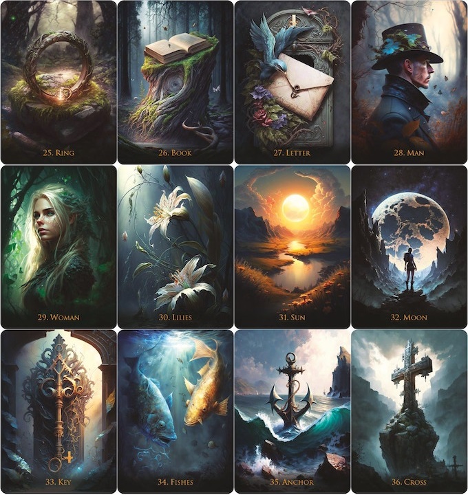奇幻藝術風格的雷諾曼牌。這套牌與對應的 Weird World 塔羅以同一個怪異世界為背景,圖像與經典的雷諾曼牌組相對應。