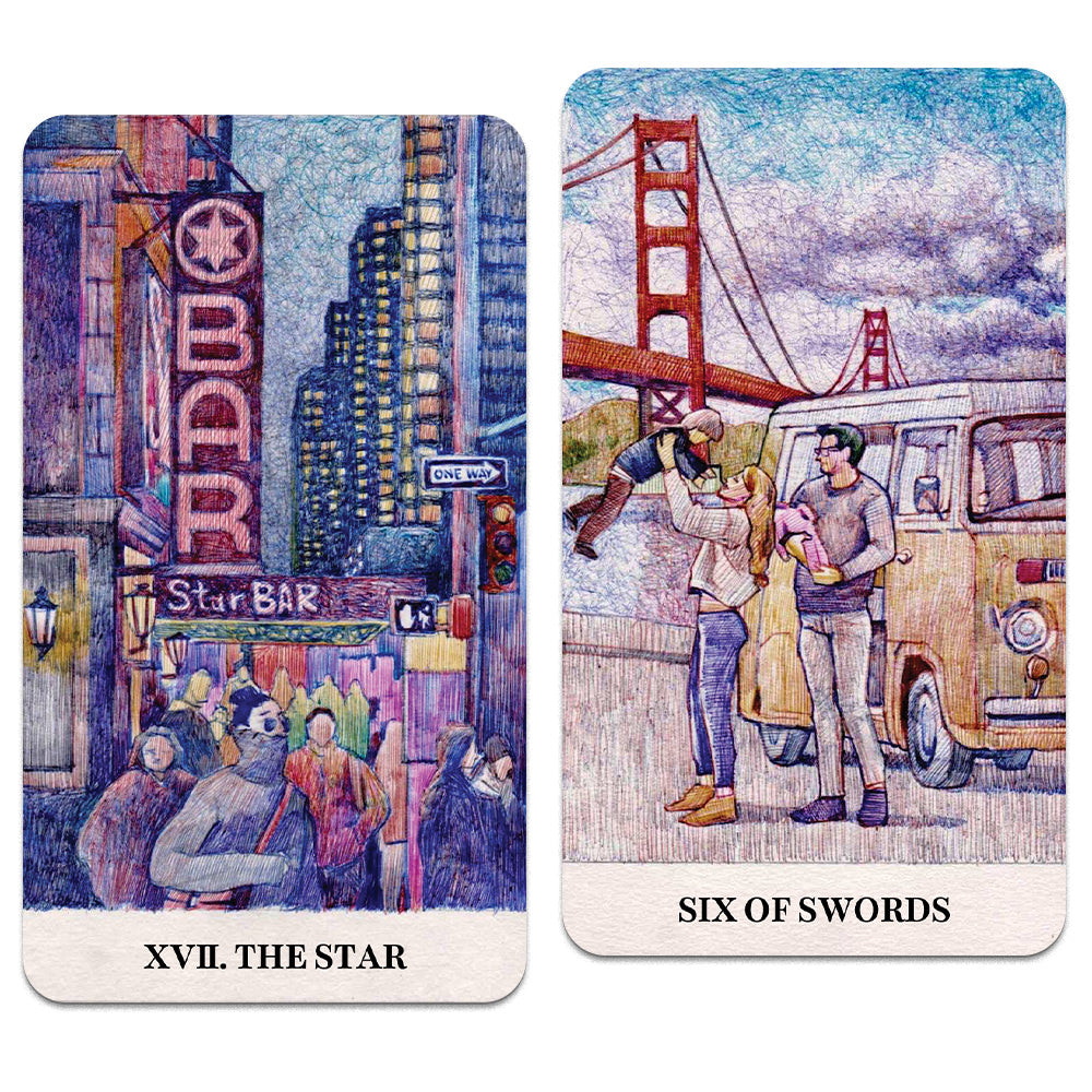 The City Labyrinth Tarot deck is about life in New York in the early 2000s. The phones, computers, and cars that the characters use are typical of the time and already seem outdated. In addition, some Arcana contain direct references to the millennium. Thus, the heroine of The High Priestess resembles the Oracle from the film ‘The Matrix,’ and the card The Tower depicts a tragic terrorist attack on the Twin Towers.