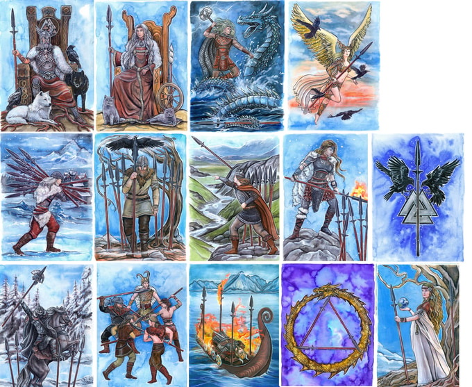 這副牌的小牌設計與"存在之旅"塔羅牌類似,每個牌組對應一個神話體系:權杖牌組是北歐神話,聖杯牌組是斯拉夫神話,寶劍牌組是凱爾特神話,金幣牌組則是埃及神話。除了保留凱爾特結構,牌面也變成滿版設計,更有代入感。