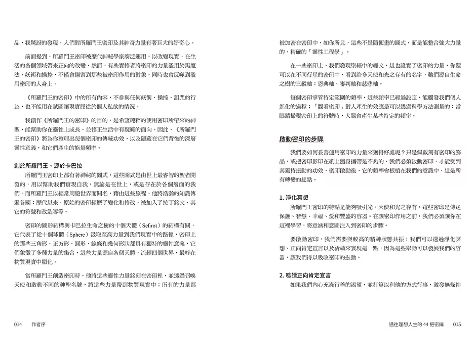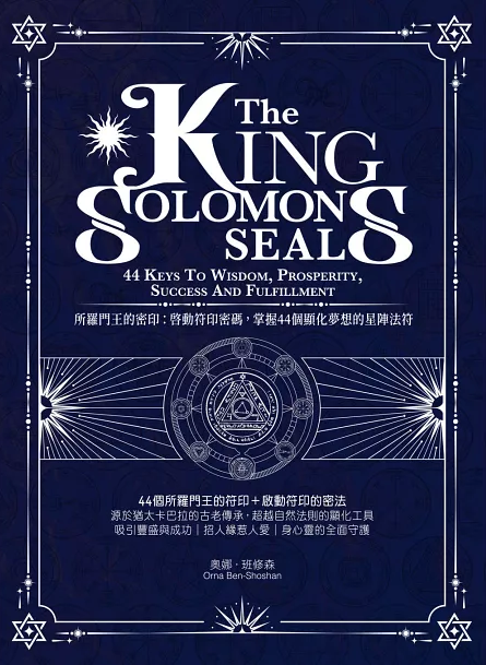 註:本書內容「不是」兩本中世紀編著的《所羅門的鑰匙(Key of Solomon)》、《所羅門的小鑰匙(The Lesser Key of Solomon)》,也與72魔神無涉;本書內容所載之44個符印,是以七大天體(木星、火星、水星、月亮、土星、太陽、金星)命名、連結天使與神聖存有的能量頻率而帶來的作用力。