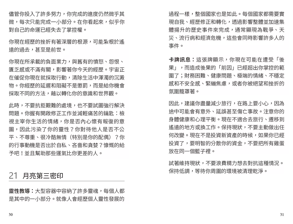 雖然小本但一樣不馬虎,同樣的大範圍燙銀封面,維持精緻且高頻的狀態;解說風格傳達了清晰易懂的訊息,讓你快速得到解答,包含現在身處的境況、建議的行動之外,還能提供你重要的「靈性教導」,如果你選擇在生活中應用教導的內容,將有助於擴展你的意識,並以最佳方式實現自我。這重要的「靈性教導」,就在每則密印解讀內容中的開頭,而大多時候,你只需閱讀靈性教導,你就能理解自己的處境。