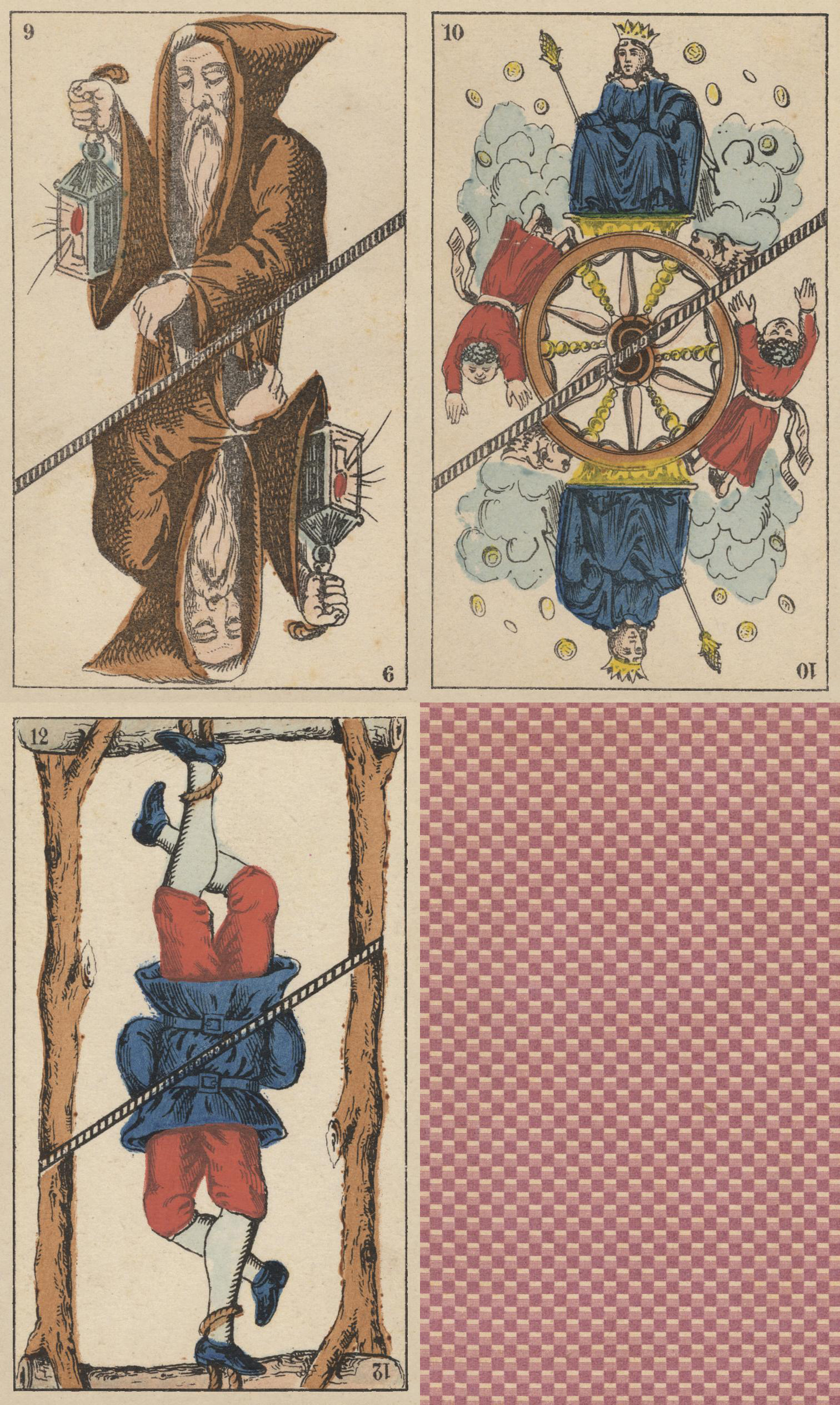 First published in the French capital during the second half of the 1800s, this Tarot de Besançon displays a unique aesthetic feature: a diagonal bar that runs across the images of the Major Arcana and court cards, dividing and mirroring the subjects in an unprecedented fashion. As with all other products in the Anima Antiqua series, this one too is available in a limited edition of 3,999 copies only.