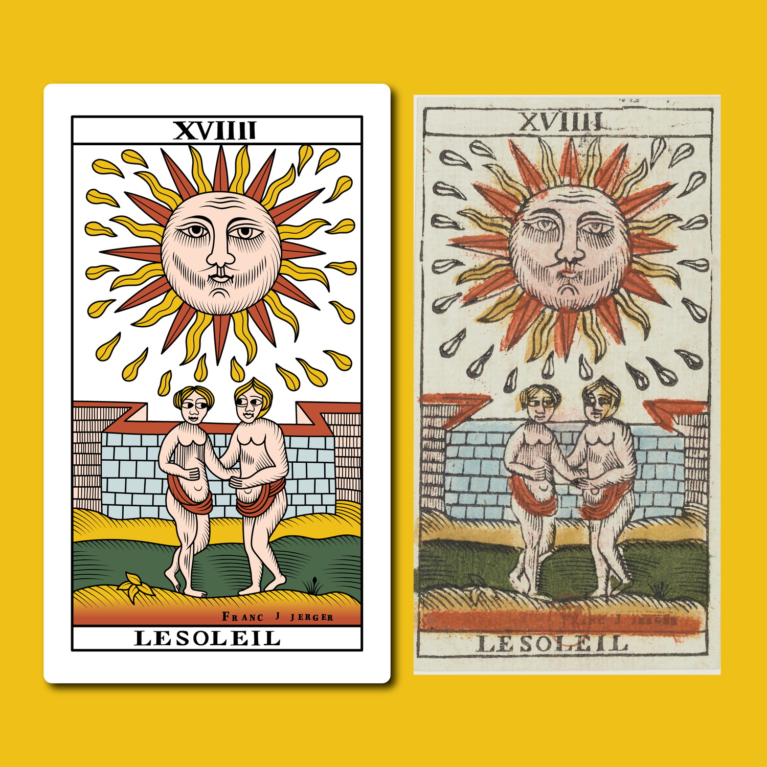 This restoration is based on the 1820-1845 tarot deck createdby German-born master cartier Jacob Jerger in Besançon, France. The original decks were printed from carved woodblocks and colored with stencils.