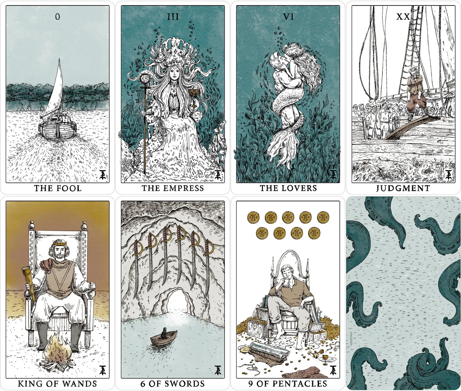 Tempest Tarot 邀請你踏上航海冒險之旅,探索海洋領域的奧秘和秘密。當你冒險越過淺灘,到達了深海,挑戰你去尋找內心真理的寶藏時,你會發現你的視角正在轉變。神話中的海洋生物、活潑的海盜和迷人的美人魚幫助你在 78 張塔羅牌中探索新視野。