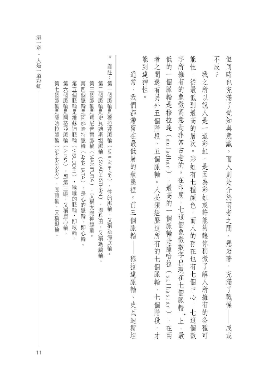 這是一本深入討論靈妙體的奇書:以太體、星光體、心智體、靈性體、宇宙體與涅盤體。脈輪是靈妙體的一部分,在生理構造上有相對應的位置。從肉身體到靈妙體,每一重都帶來相對應的課題與道途。奧修說:人是一道彩虹,擁有所有的七種顏色。而這七種顏色象徵著人的潛能,走過這七種道途的啟示,人才能譜出內在神性的和諧。
