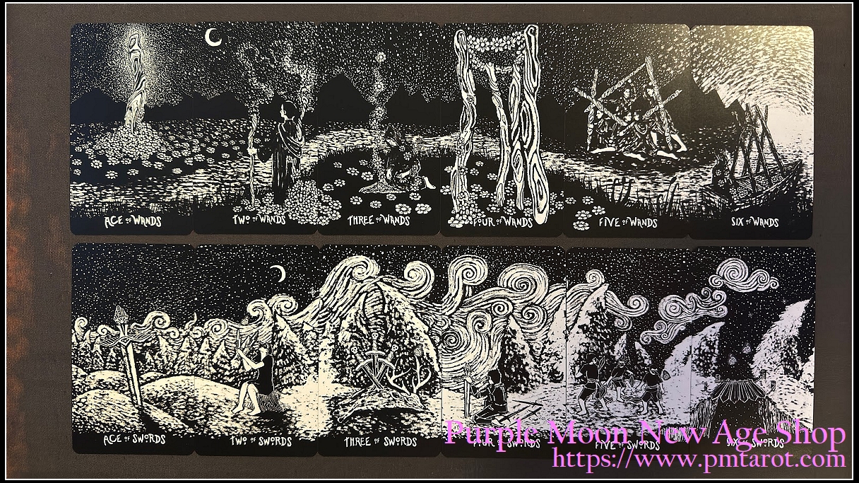 Night Visions 是 Light Visions 的黑暗姐妹,具有金屬紅色箔裝飾和鍍紅色牌邊。與 James 的其他作品一樣,小阿卡納牌是可以排列成一幅完整的圖案。