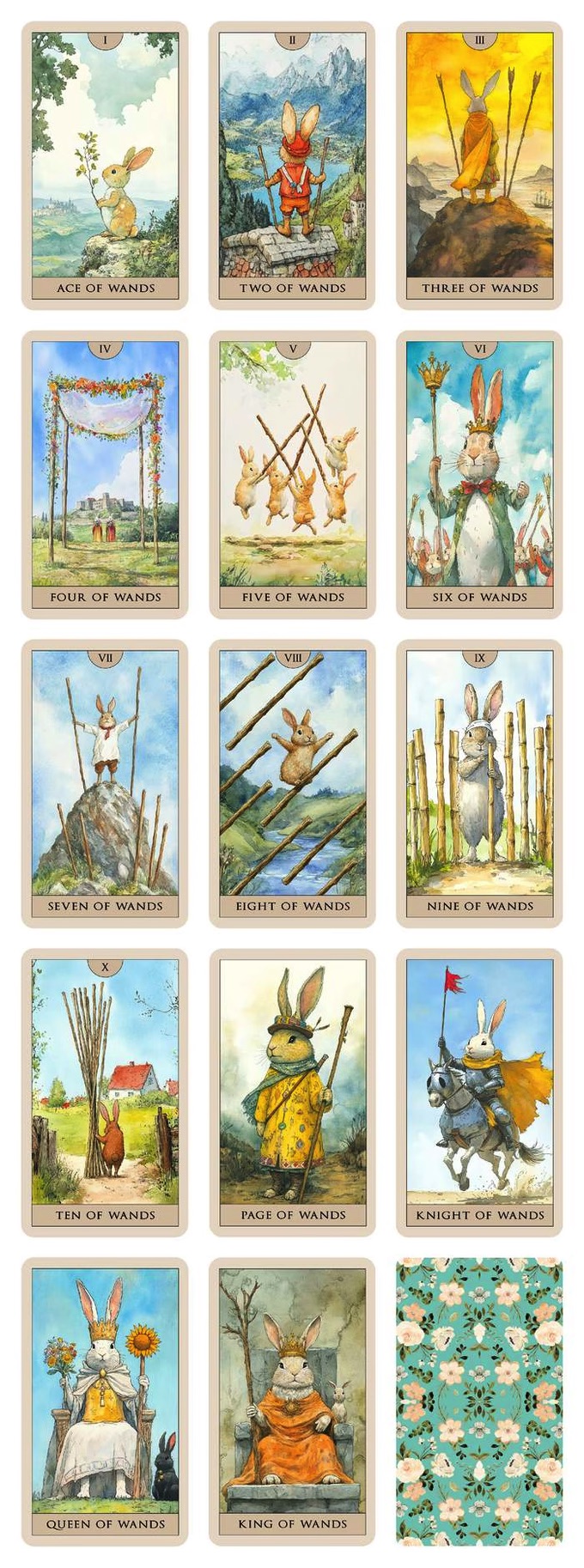 本產品需要付全數訂金訂貨,一般需時約 3-6 星期到貨。這副兔子主題塔羅牌融合了兔子與人類元素,整體風格以水彩畫感為靈感,並以童話書氛圍作為主要參考來源。每張牌皆展現出獨特的兔子角色,帶有專屬的個性、背景故事與象徵意涵,讓閱讀過程充滿童趣與靈性象徵。卡牌大小為 70 x 120mm(標準塔羅尺寸 2.75" x 4.75"),材質選用 350g 紙卡,雙面印刷,呈現細膩色彩與紋理。卡盒設計靈感源於「開啟禮物」與「打開童話書」的感受,採用霧面處理的上下蓋式硬盒,外觀精美,既具收藏價值又能妥善保護整副卡牌。