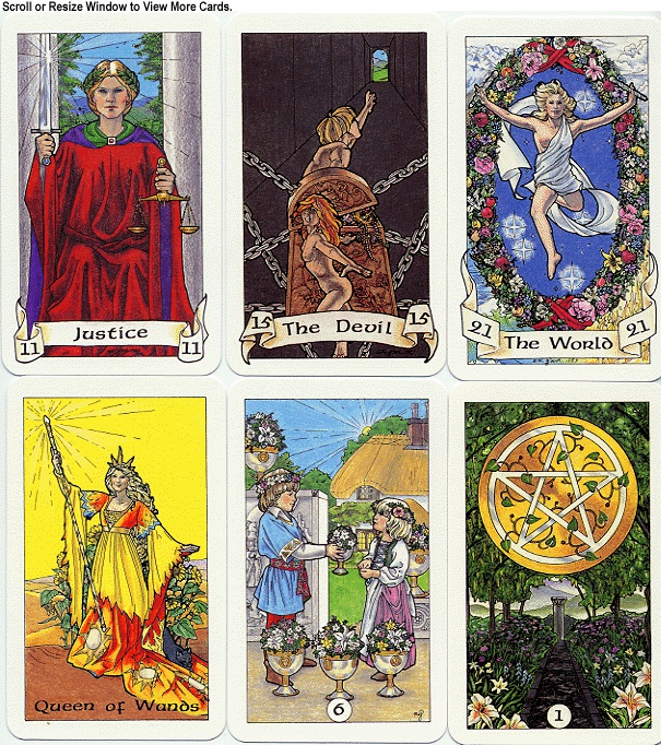 The shining strength of this deck lies in the fifty-six cards of the Minor Arcana. The characters on the cards almost seem to breathe. Often, the cards seem so dimensional you get the feeling you could jump into them. Watch the boy carve pentagrams on wooden disks in the eight of Pentacles. Gleefully help steal blades in the five of Swords. Join in the merry dance on the four of Wands.