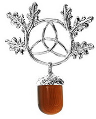 Triskel Oak has oak leaves surrounding a triskel celtic knot from which there is an acorn shaped and coloured crystal and can be worn for "Personal Growth and Development".