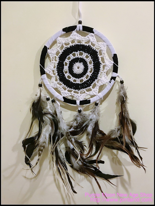 Black and white crocheted dream catcher decorated with feathers and beads. These are often hung above cribs or in the windows and above doorways of the rooms where childeren sleep and sometime near the sleep area of adults with troubled sleep to catch the bad dreams and the spirits who send them within the web of the dream catcher. Hoop 6 1/4".