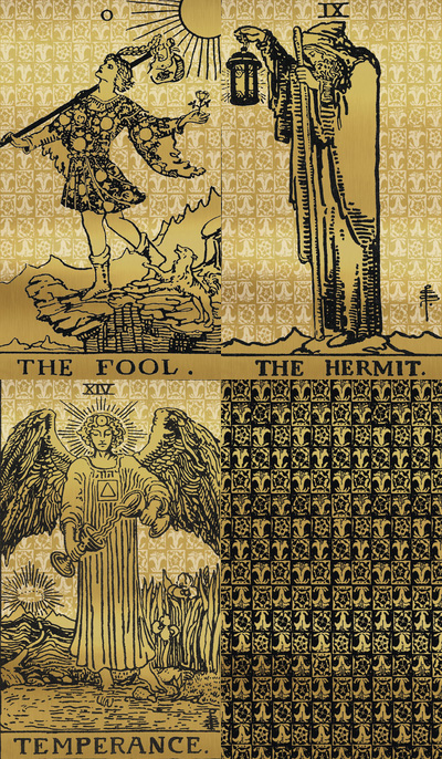 Discover a deck with a whole new approach to color and design with the Black & Gold Tarot. Based on the pictorial key of the traditional Rider-Waite-Smith tarot and printed with elegant gold-foil details, this deck makes for a breathtaking tableau as the cards are laid out in a spread. Whether you are a reader or a collector, you will realize fresh possibilities and interpretations with this creative work of art. Featuring a new hardbox with an angled, cut-hinged top, this tarot truly stands out from all the rest. Includes a 78-card gold-foil deck and instructional booklet.