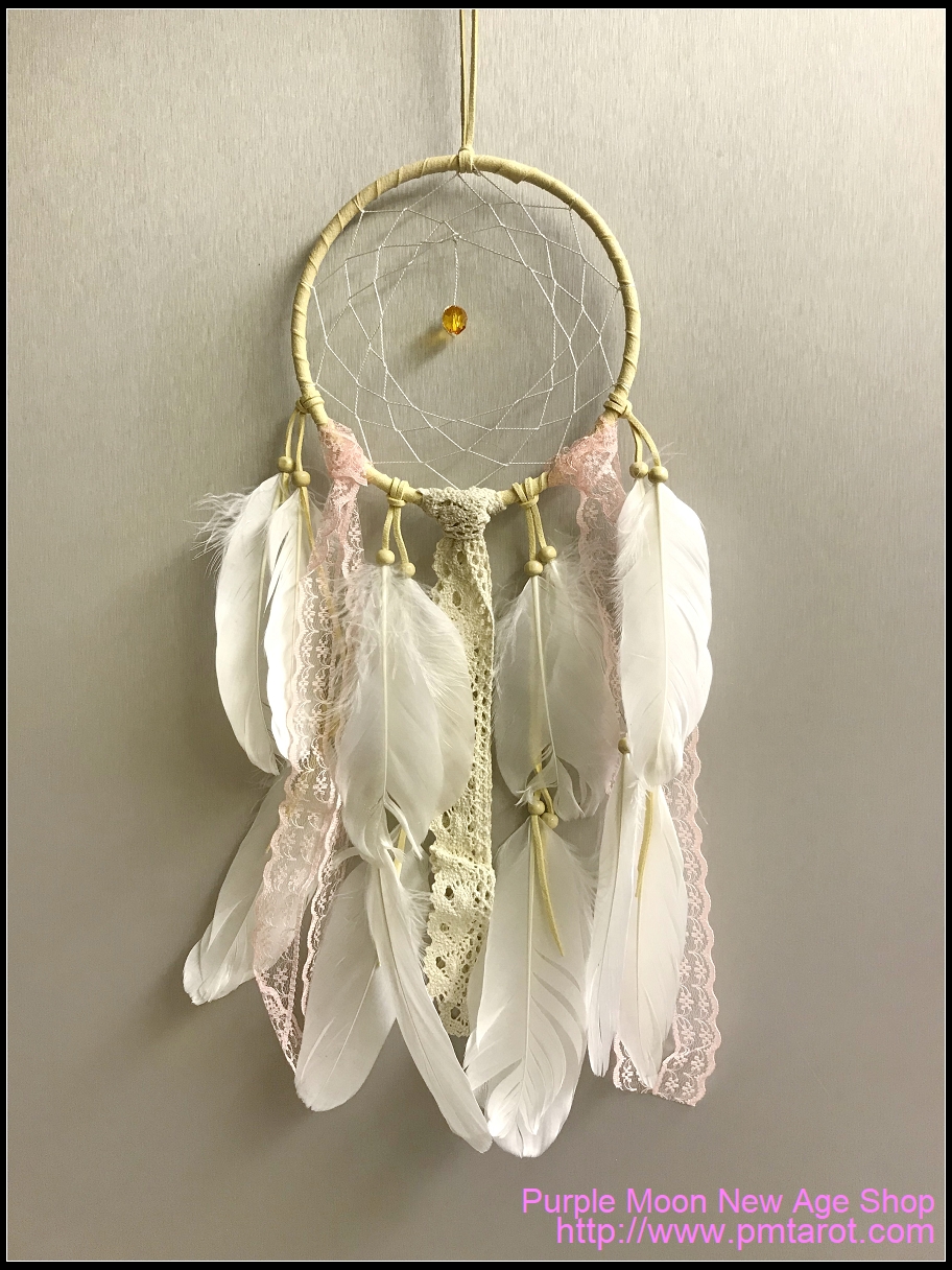 Simple dream catcher decorated with feathers and beads. These are often hung above cribs or in the windows and above doorways of the rooms where children sleep and sometime near the sleep area of adults with troubled sleep to catch the bad dreams and the spirits who send them within the web of the dream catcher.