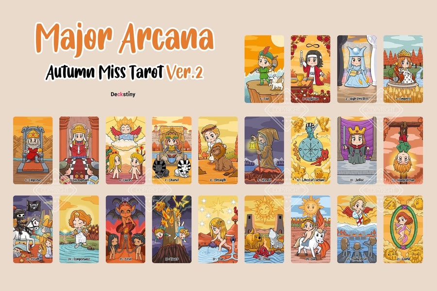 Whether you're a seasoned tarot reader or just starting out, Autumn Miss Tarot V2 is the perfect deck for you. With its cute cartoon characters and vibrant color scheme, this deck is sure to inspire your creativity and intuition. Let the energy of autumn guide you as you seek answers to life's deepest questions, or simply use the deck for fun and inspiration.