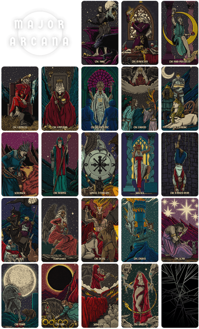 *The deck will consist of the full 22 Major Arcana and 56 Minor Arcana, broken into four suits of wands, cups, pentacles, and swords.