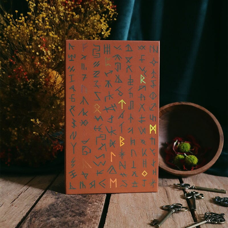 This item is required advance payment to order and estimate arrived in 3-4 weeks.Set of 33 cards with prismatic gold gilded edges in a custom orange box with a 65-page guidebook and 4 runic dice that can be used in tandem with the cards or on their own. Check out our blog post for a closer look.