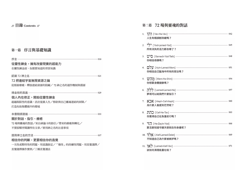 「覺察與意識、清除與精煉、創造與轉化」為靈性鍊金三個階段,必須先覺察、才知道要清除什麼阻礙、與隨之而來的轉化改變,這也是「吸引力法則」的運作過程;本書中的每一組神之名皆以一句提問為標題,引導讀者開啟與自我對話,從不同的角度來覺察自我,並且具體描述阻礙的問題點,以及提供如何使用神之名的支持能量,來度過清除與轉化的過程。