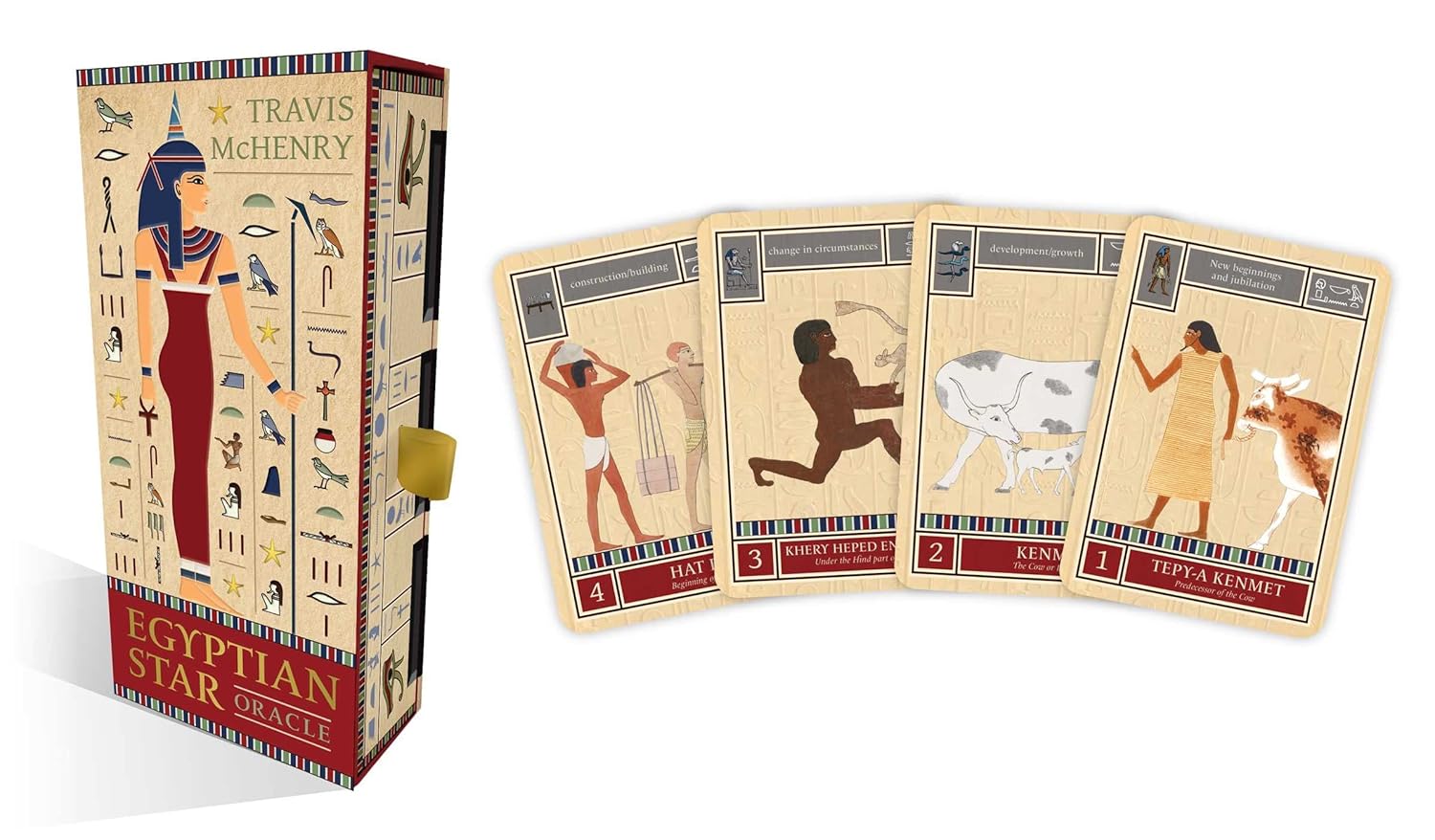 Produced with exceptional detail, the Egyptian Star Oracle features 42 cards printed in full-color with gilded edges, an extensive 144-page guidebook, and comes with a small Eye of Horus charm all packaged in a sarcophagus-shaped boxed adorned with motifs of Egyptian art. Renowned occultist and best-selling author Travis McHenry has sourced all the images on these cards from ancient Egyptian artwork, including papyrus, pottery, and from the walls of tombs. The background of each card contains a snippet of texts that the author personally gathered from the Pyramid of Teti in Saqqara. Each card includes historical details, meaning, and ritual uses.